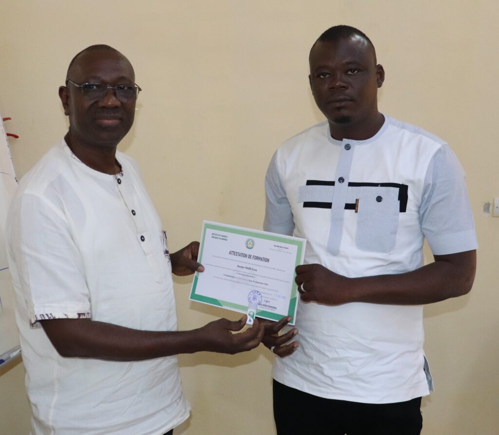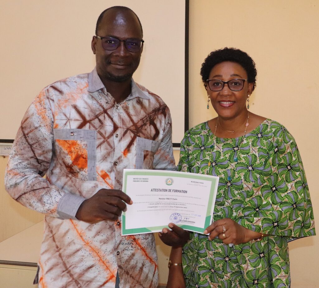 La Directrice des études et des stages (DES) de l’Institut des finances publiques du Burkina (IFPB), Mme Yvonne HEMA/SAGNON a présidé, mercredi 17 septembre 2025, les cérémonies de clôture des sessions de formation sur les thèmes « Qualité de service, accueil et satisfaction du client » et « Techniques bancaires ».